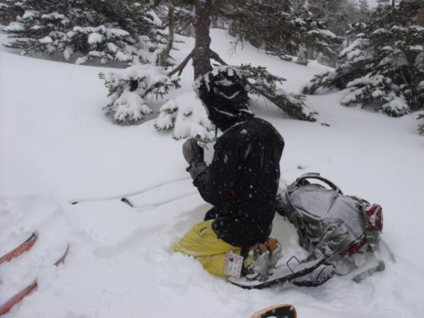 スノーボード杉浦、山スキー上野はツリーランを気持ち良く滑走、しかしテレマーク松林は悪戦苦闘転びながら降りて来ました。スノーシュー松岡は悠々自適。