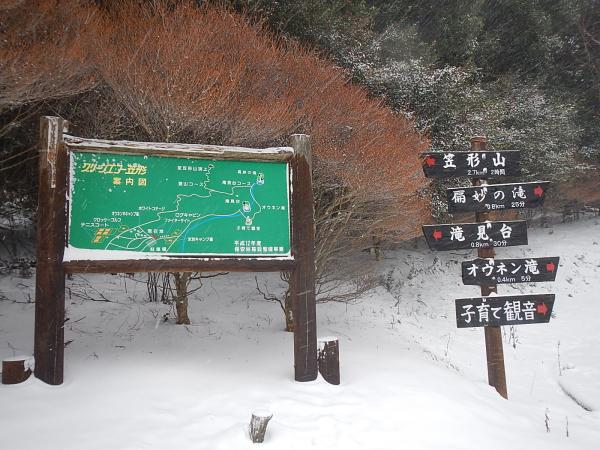 - グリーンエコー笠形-(20分)-キャンプ場-(40分)-扁妙の滝-(60分)-5合目-(50分)-稜線-(15分)-笠形山-(80分)-キャンプ場-(15分)-グリーンエコー笠形