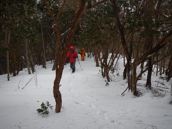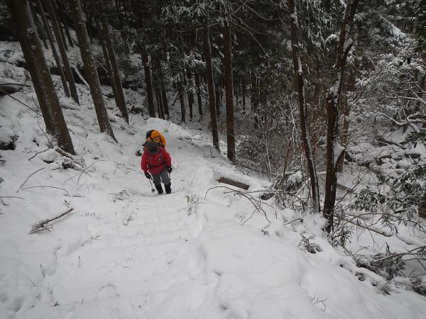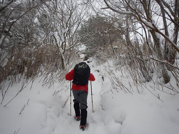 - 昨晩からの雪で登山道には滑りやすいところが多く、アイゼンは必携です。6合目の登りは膝下、稜線に出てからは膝上まで埋っていました。