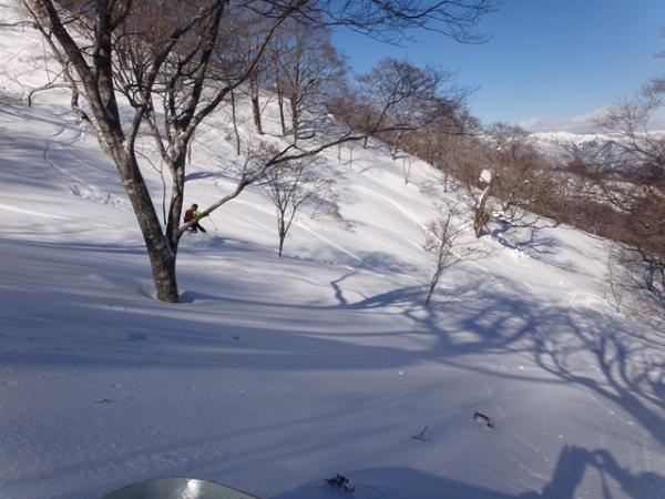 谷は柔らかい雪と硬い雪が入り混じり、滑走はテクニックを要する。