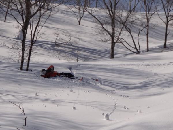 谷筋は硬い雪と柔らかい雪が入り混じり、滑走中にバランスを崩して転倒することが多かった。