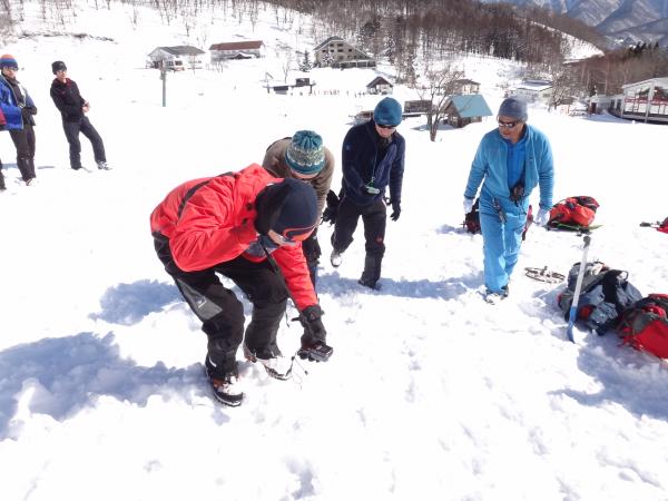 1日目は素晴らしき好天。青い空をバッグに後立山の名峰が横一列にズラリ。小谷のトンネルを越えて五竜菱が目に飛び込んできた時は、そのあまりのかっこよさに思わず声を出してしまいました。登りたい…!という気持ちは胸にしまい込んで、気合を入れて研修スタートです。