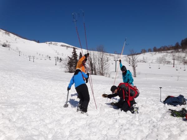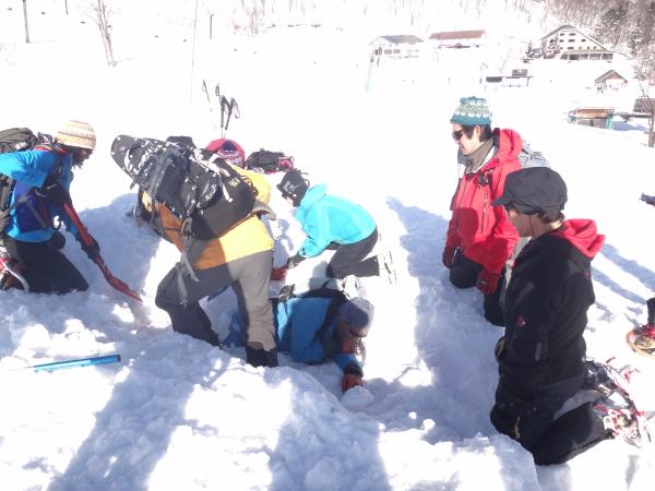 スキー場のゲレンデにて、ビーコンによる捜索から、プローブとショベルを用いて目標を掘り出すという一連の流れをグループごとに取り組みました。「雪崩発生!」の合図をもとに、斜面を全速力で駆け下り(スノーシューでうまく走れずこけてしまいました)、リーダーの指示のもと、ビーコン班、プローブ班、ショベル掘削班に分かれて必死に探索します。焦って見当違いの場所を探したり、ショベルの柄を落としたり、プローブが伸びきっていなかったり…実際に雪崩が起きたら全員巻き込まれること必至です…。道具を使いこなすだけでなく、チームワークもさらに大切であると感じました。