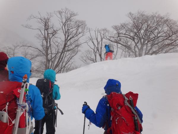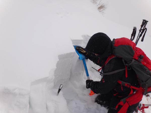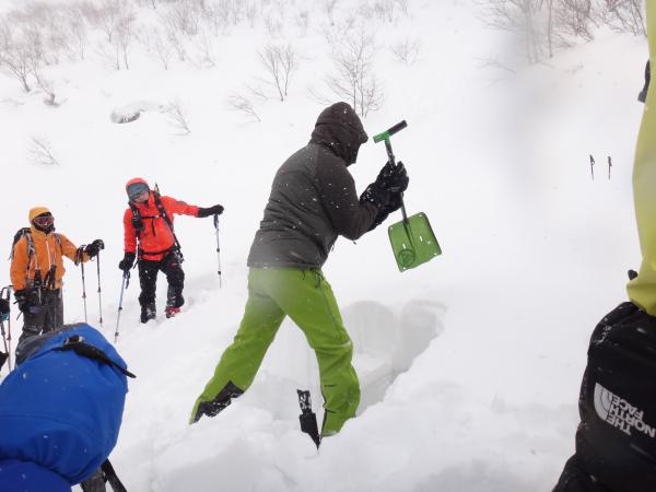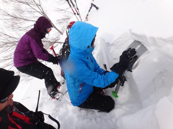 2日目は山に入ってルートファインディングとスノーソーを用いて積雪評価の訓練。木々の生え方から雪崩の跡を予想したり、雪庇に注意したりと、常に神経を尖らせながら進むことを要求されます。積雪評価ではショベルとスノーソーで雪を切り出し上から圧力を加えることで、どの程度雪が脆いかを測り雪崩の発生度を予想します。どちらも繰り返し訓練して、適切な勘を身につけることが必要です。