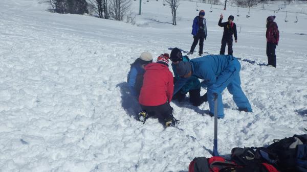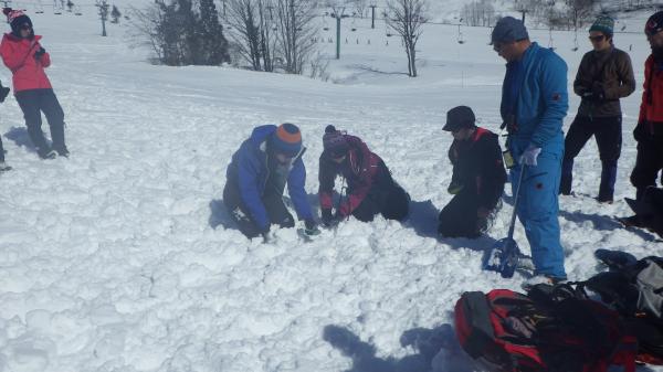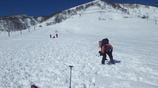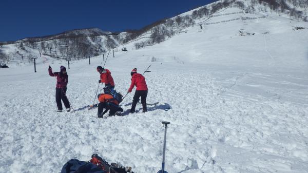 初日はスキー場ゲレンデでビーコン探索、プローブ・ショベルを用いて埋めたザックを掘り出します。