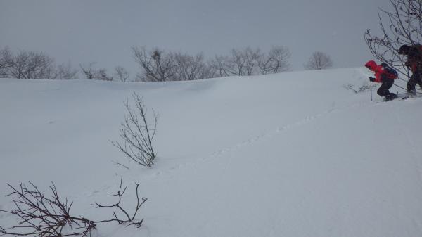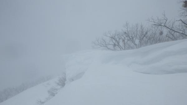 雪庇が危険、雪原みたいにだだっ広い個所を下って良いのかしら?、と疑問が次々湧いてきて、なかなか踏み出せない状態に。