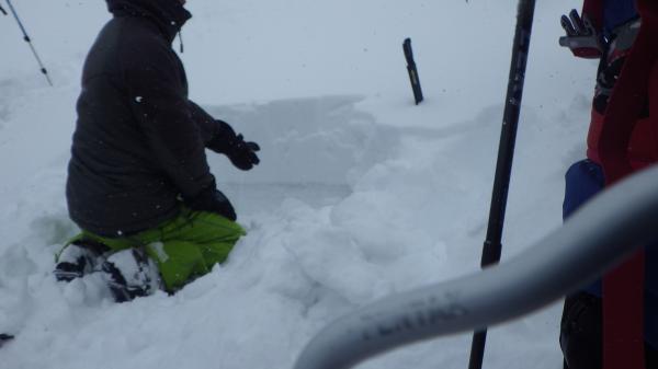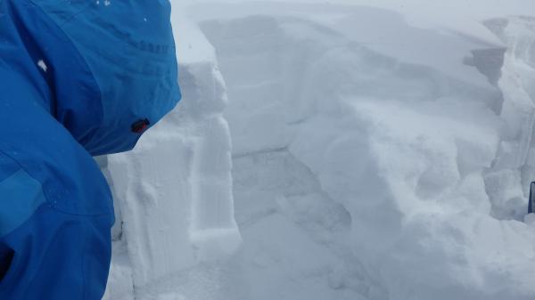 そんなに深くない所にサンクラスト状態の層があり、モロモロと崩れます。今はボロボロ崩れる状態ですが、雪同士の結合が始まったらスラブ状になるんかな、などと考えました。