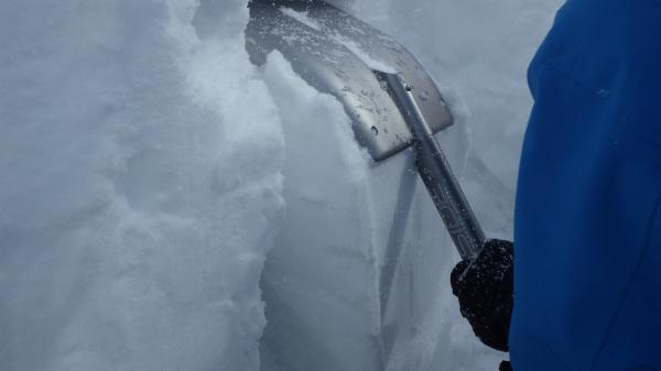 積雪評価では、コンプレッションテスト・バープテストを行いました。スノーソーを使って雪を切り出し、ショベルを当てて叩きます。
