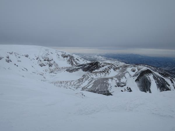 熊野岳へは一旦下ってから登るルートだったが、下りもボコボコなのでまともに滑れなくて我慢の下り。