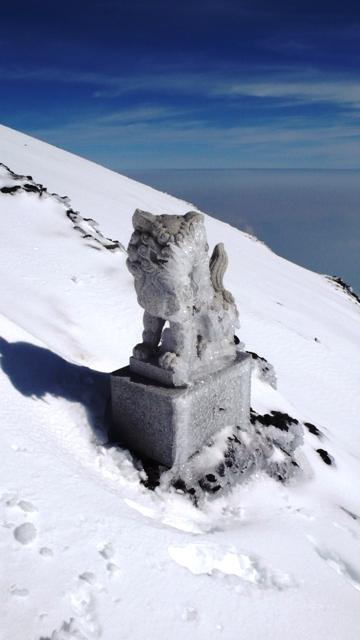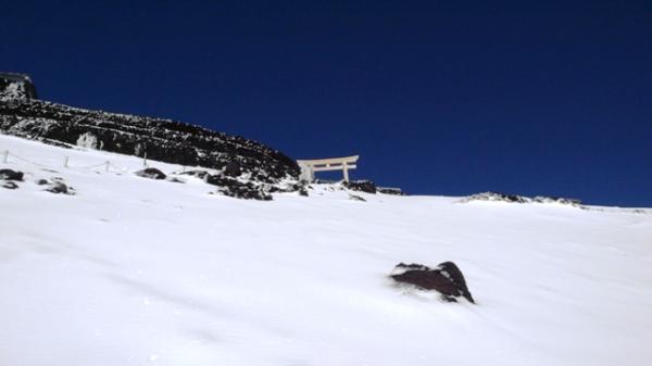 ・明け方は氷点下でアイゼンが効くようになり少し登りやすくなりました。鳥居をくぐるにはかがまなければならないほど雪は深かったです。