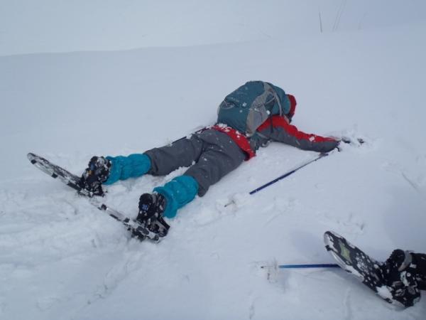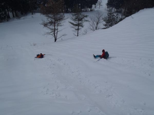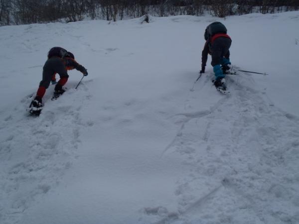 下りはゲレンデ方面に下りていき、スキーヤーやボーダーを見ながら新雪を駆け下りたり尻セードしたり童心に帰って雪を満喫しました。