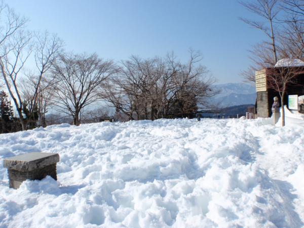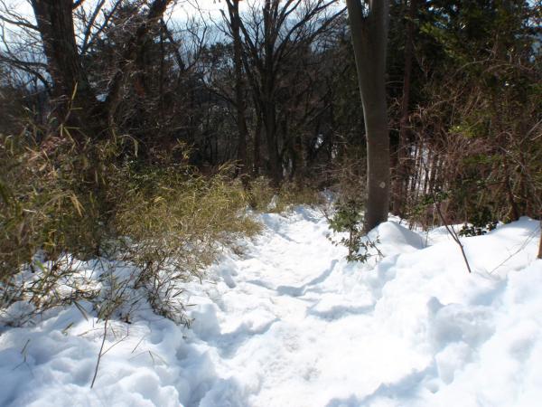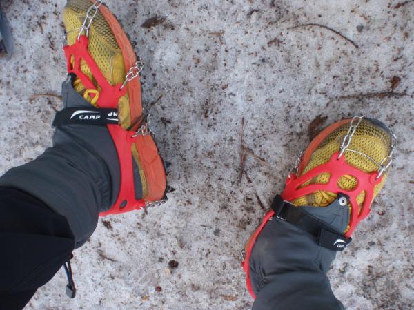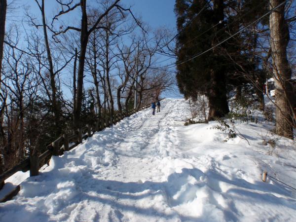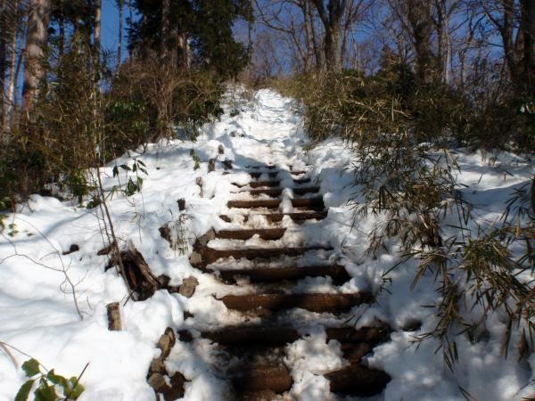 ・稲荷山コースは山頂直下の階段が雪で埋まり、スロープ状になって滑りやすいです。コース下部はぬかるみと雪が交互に現れる感じです。装備としては軽アイゼン、スパッツなどは必携と思われます。