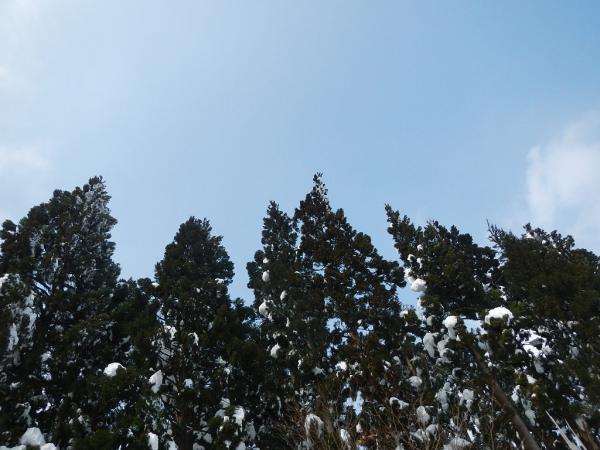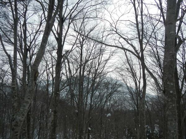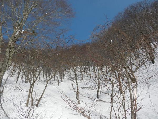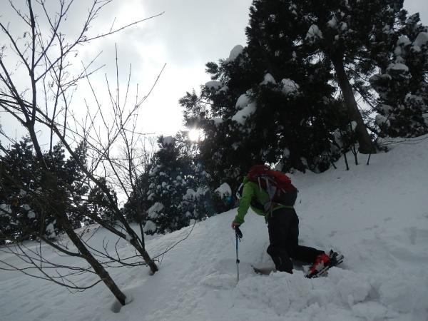 気温が高かったので樹林帯では頭上からの雪爆弾の落下をよけながら無事山頂へ。