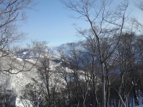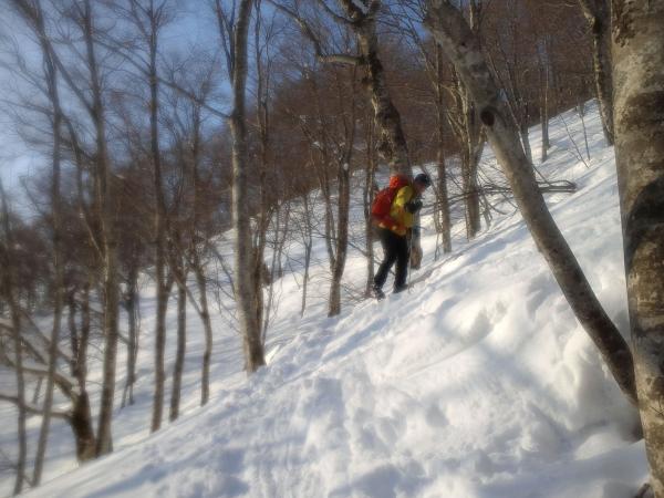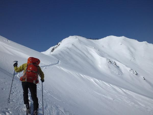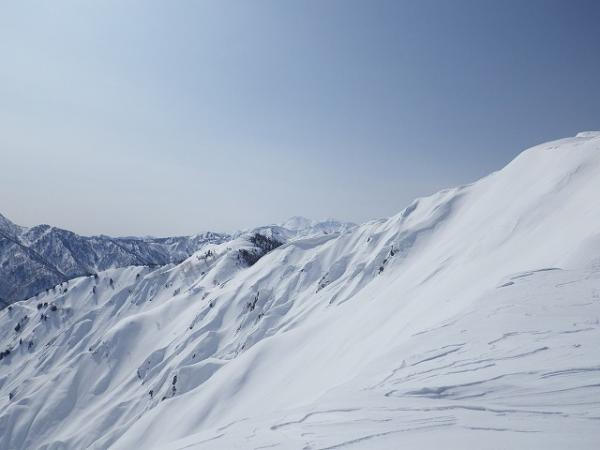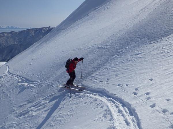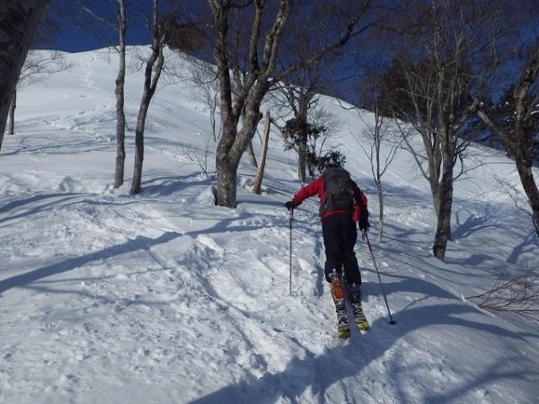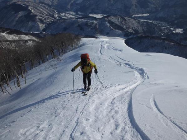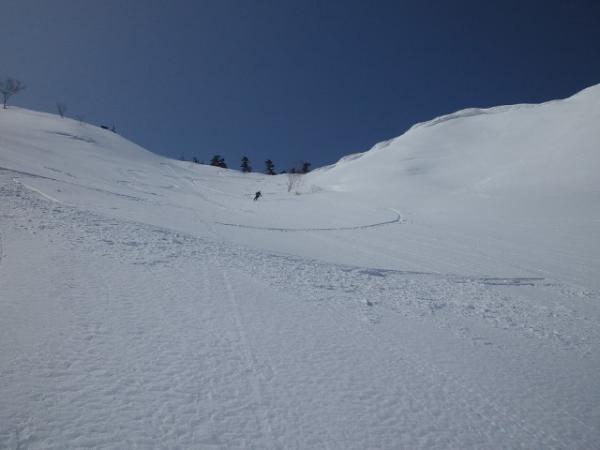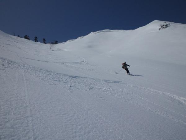 白谷の滑降をあきらめ、登路で使用した尾根を下りました。