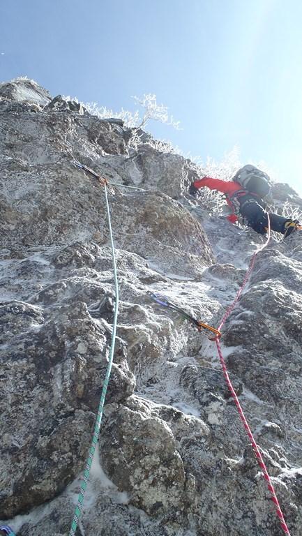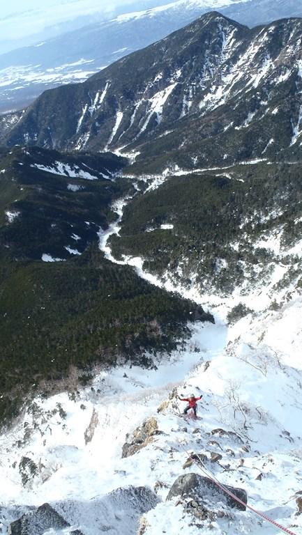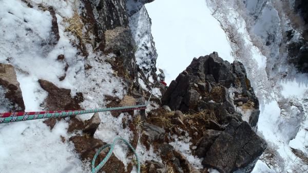 装備ですが、ダブルアックスよりもシングルアックスの方が良いかもしれません。残置支点は多くありますが、雪の付き方で埋まることもあるのでハーケン類やキャメロット(小さめ)を持っていくと心強いでしょう。
