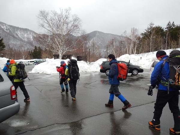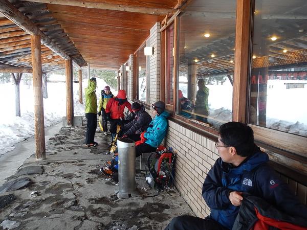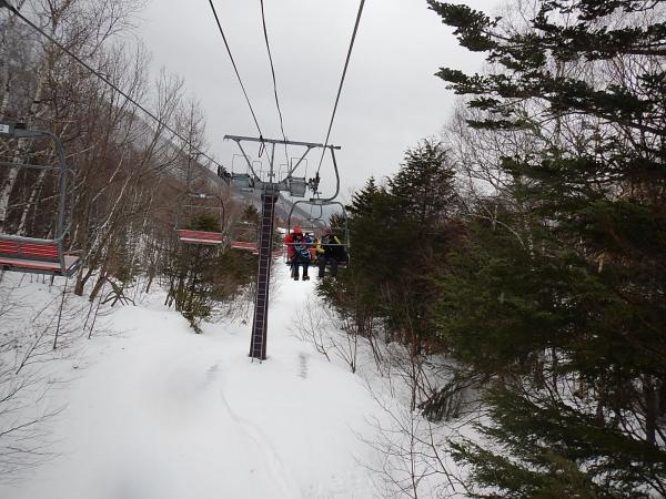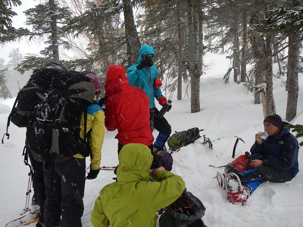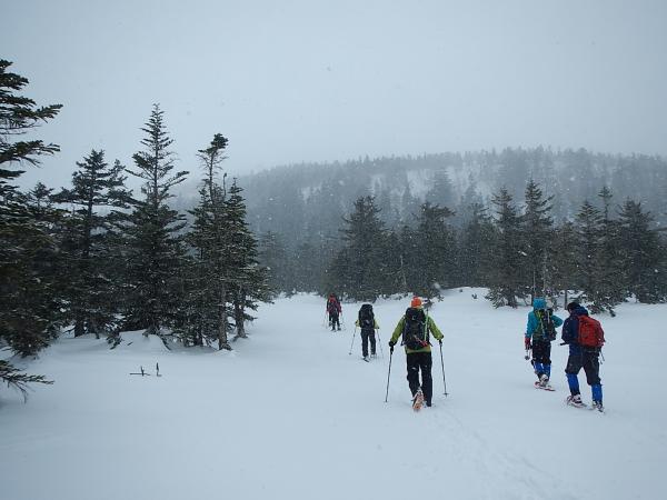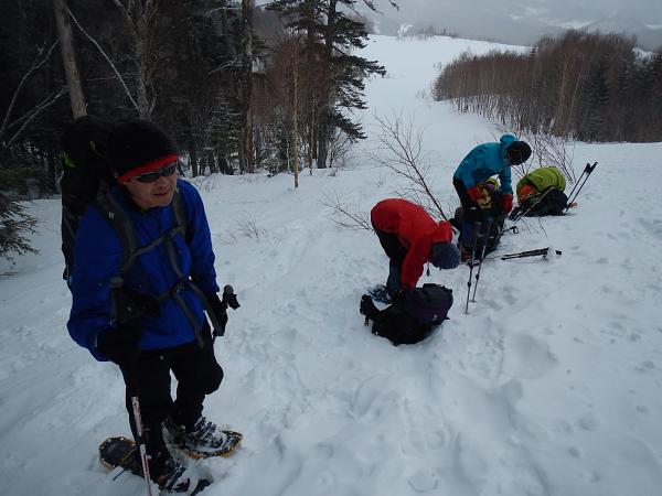 まずはリフトでスキー場最上部へあがり、各々思い思いの装備に身を包んで防火帯を登っていきました。広い防火帯を登っていくので道迷いはありませんが前夜の降雪でトレースがわかりにくく踏み抜き等、膝上まで埋まることもあるのでワカンかスノーシューがあれば良いでしょう。