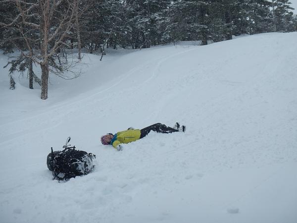 位が原下部で休憩をとり、吹き溜まりで携帯ソリを使って雪遊びを満喫!